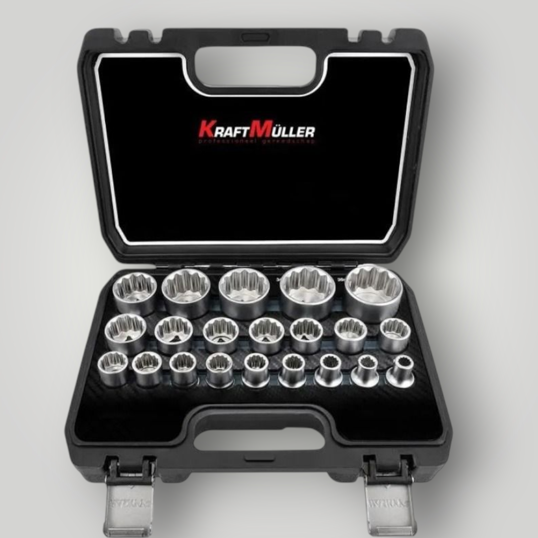 Le coffret de 21 douilles 12PT de la marque KraftMuller en 1/2 est un ensemble d'outils essentiels pour les travaux mécaniques et de bricolage. Voici le contenu détaillé du coffret :