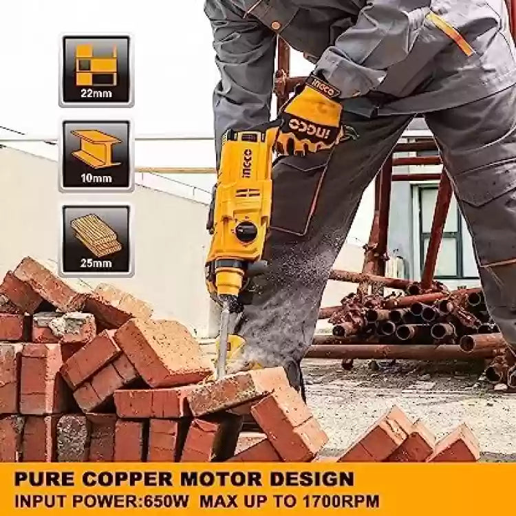 Marteau perforateur INGCO 650W RGH6528 excelle avec ses caractéristiques avancées. Polyvalent, durable et sécurisé, il surpasse les attentes pour les projets domestiques et professionnels. Livré dans un BMC robuste, il est prêt à être utilisé dès la sortie de la boîte. – Tension (220-240 V ~ 50/60 Hz) : alimentation stable pour performances optimales – Puissance d’entrée (650 W) : force adaptée à divers matériaux – Vitesse à vide : 0-1700 tr/min, contrôle précis pour chaque application – Taux d’impact : 0-5500 bpm, impact efficace pour des résultats rapides